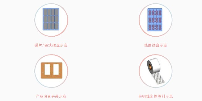 2.來料方式:雙面膠、銅線泡棉均為卷料供料,鋁塊、磁片、線圈為托盤上料;